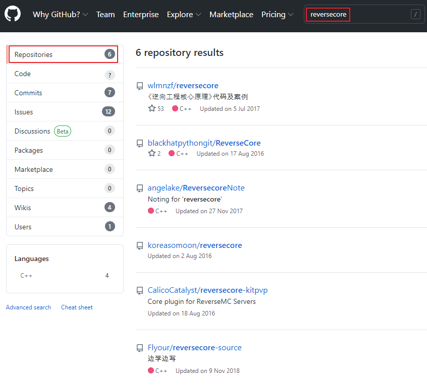 github.com 에 이미 reversecore 이름의 repository 가 6개나 있더군요.